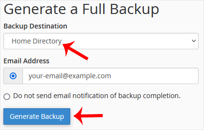Backing up is important, and you should do it regularly. Follow this tutorial to make a full backup of your website with cPanel. 1. Log in to your cPanel account. 2. In the Files section, click on Backup.3. Under Full Backup, click on Download a Full Website backup. 4. From the drop-down menu, select the backup destination as Home and enter your email address in the email field to receive a notification when the backup is complete. After the cPanel backup is finished, you will receive a notification. You can download backups from Backup > Download a Full Account Backup.
