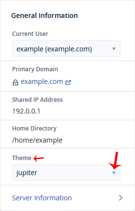 Switching over to another cPanel theme with a different style is easy.1. Log in to your cPanel account. 2. In the General Information panel. You should see a Theme option with a drop-down menu. 3. Choose your favorite theme from the drop-down menu, and it will apply automatically.