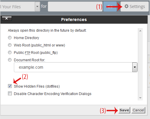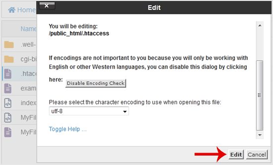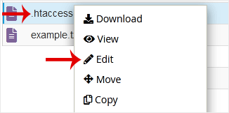 1. Log in to your cPanel account. 2. In the Files section, click on File Manager. 3. Navigate to the directory where your dot htaccess file is located. To edit the .htaccess file of your root directory, navigate to the public_html directory. 4. If the dot htaccess file does not show, click on Settings in the File Manager. You can find the Settings button on the right side of the top menu. Mark the Show Hidden Files (Dotfiles) option in the new window box and click on Save. Now, the dot htaccess file should be present. If it does not exist, create a new one. 5. Right-click on the dot htaccess file and then Edit in the Context Menu. 6. In a new window box, click on Edit. 7. Make changes to your dot htaccess file and click on Save Changes.
