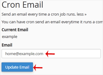 You can enable cronjob notifications or update a cronjob's email address in cPanel. 1. Log in to your cPanel account. 2. In the Advanced section, click on Cron Jobs. 3. Under Cron Email, you should enter your full email address in the text field.4. Click on Update Email.