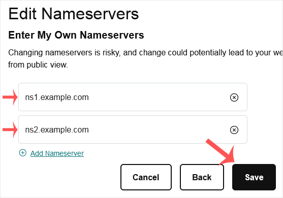 You can find our nameservers in your hosting welcome email. You need to update your domain nameservers to our nameservers.If your domain is registered at GoDaddy, you should follow this tutorial to update your domain's Nameservers.1. Visit Godaddy.com and click on Sign In. Under "Registered Users", click again on Sign-in. You will be redirected to the login form. 2. Enter the Username or Customer ID and the password of your GoDaddy account. Then click on Sign In.3. After a successful login, under the Domains section. Click on DNS next to the domain you wish to manage.4. Scroll down to the Nameservers and click on Change.5. Scroll down to the end of the page and click on Enter my own nameservers (advanced).6. Enter your nameservers in the text fields and click on Save.Note: It may take anywhere from 12 to 24 hours for the changes to take effect worldwide.