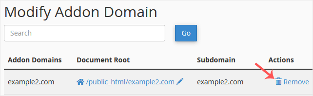 1. Log in to your cPanel account. 2. In the Domains section, click on Addon Domains.3. Locate the addon domain under Modify Addon Domain and click on Remove.4. Click on Remove once more. You should see a message that your addon domain has been removed.