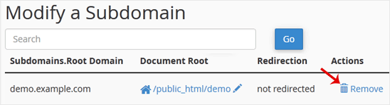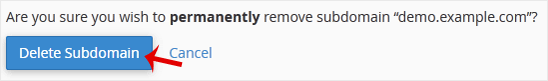 A subdomain is an additional part of your primary domain. Please, follow this tutorial to remove a subdomain in cPanel. 1. Log in to your cPanel account. 2. In the Domains section, click on Subdomains. 3. Under the Modify a Subdomain list, you can see a list of subdomains.4. Click on Remove under the Actions tab.5. For confirmation, click on Delete Subdomain to remove your subdomain permanently.