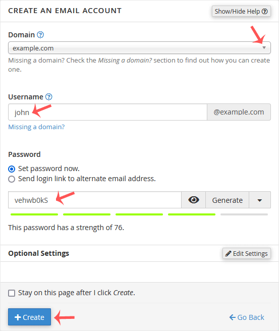 To create a new email address, perform the following steps: 1. Log in to your cPanel account. 2. In the Email section, click on Email Account. 3. Click on +Create. You can find this on the right-hand side. 4. Under Create An Email Account, fill up the following details: Domain: Select the appropriate domain from the drop-down list if you have more than one domain.Username: Enter a username such as your first name.Security: Select Set password now, enter a password, or use a generator to generate one. Optional Settings: Click on Edit Settings to expand. In the Storage space option, enter the amount of storage space or select the Unlimited option. 5. Click on Create. Once your email account is created, it will appear under the Account & Domain tab.