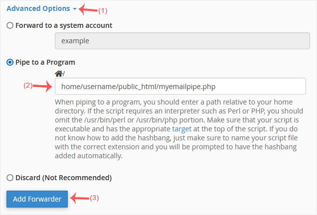 How to forward an email? 1. Log in to your cPanel account. 2. In the Email section, click on Forwarders and then click on Add Forwarder. 3. Enter the following details: Address to Forward: Enter the email address you want to forward. If you're going to forward your myemail@example.com to a custom e-mail address, enter myemail in this field. Domain: Select the appropriate domain from the Domain drop-down list if you have multiple domains. 4. In the Destination field, select Forward to email address and enter your custom e-mail address on which you want to receive forwarded emails. 5. Click on Add Forwarder. How to forward an email to a mail pipe script/program? 1. In the Email section, click on Forwarders and then choose Add Forwarder. 2. Enter the following details: Address to Forward: Enter the email address you want to forward. Domain: Select the appropriate domain from the Domain drop-down list if you have multiple domains. 3. In the Destination field, click on Advanced Options, select Pipe to a Program and enter the full path of your pipe script, such as home/username/public_html/myemailpipe.php. You may have noticed that we do not use a slash at the beginning of the URL. 4. Click on Add Forwarder.