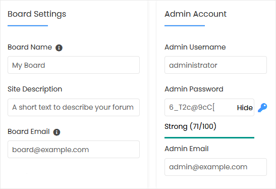 Softaculous helps you install web applications very easy. Please, follow the steps below to install phpBB Forum. 1. Log in to your cPanel account. 2. In the Software section, click on Softaculous Apps Installer.3. cPanel will redirect you to the Softaculous interface.4. On the left side, locate the Forums category. Click on it and then on the phpBB link that appears.5. Click on Install.6. Fill in the necessary fields under the Software Setup fields: Choose Installation URL: Choose the appropriate protocol/domain. Inside the "In Directory" field, should you want to install this in a directory, i.e., example.com/directory, enter the directory name. Otherwise, please, leave it blank to install in your main domain, i.e., example.com. 7. Under the Board Settings field, enter the following information: Board Name: Name of the forum. Site Description: Description of the forum. Board E-mail: The e-mail address of the forum. 8. Under the Admin Account field, enter the following information: Admin Username: Your new phpBB username (for security reasons, do not use the administrator or the admin username). Admin Password: Use a strong password. Admin Email: Your e-mail address. Note: Copy the admin username and password to Notepad. You will need those to access the admin area of your phpBB forum later. 9. Choose Language: You can choose the language of your phpBB forum. The default language of phpBB is English. 10. Advanced Options: Leave this unless you want to change the database name or take an automated backup. Please, note that creating frequent backups may take a lot of disk space.Finally, scroll down to the end of the page and click on Install.