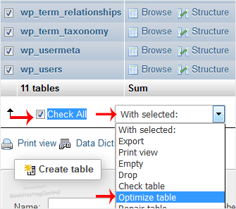 1. Log in to your cPanel account.2. In the Databases section, click on phpMyAdmin. 3. Click on the Expand icon from the navigation tree in the left sidebar. 4. Scroll down and mark Check All. Click on the drop-down option and select Optimize tables. The table has been successfully optimized.