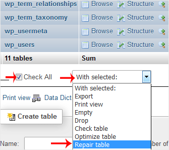 1. Log in to your cPanel account.2. In the Databases section, click on phpMyAdmin.3. Click the Expand icon from the navigation tree in the left sidebar. 4. Scroll down and mark Check All. Then click on the drop-down arrow and select Repair table.If the table has been repaired successfully, it will show an OK message. Otherwise, it will display an error on some tables.