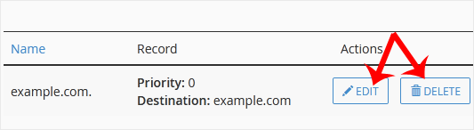 You can edit or remove a Record in cPanel using the cPanel's DNS Zone Editor. It allows you to manage, remove, or modify DNS records.1. Log in to your cPanel account. 2. In the Domains section, click on Zone Editor. 3. Under Domains, you can see many options below Actions. 4. Click on Manage.5. Locate a Record you wish to edit or remove. Should you want to edit a record, click on Edit. Modify the details, and click on Save Record. Removing a record can be done with the Delete option.Note: It may take anywhere from 12 to 24 hours for the changes to take effect worldwide.