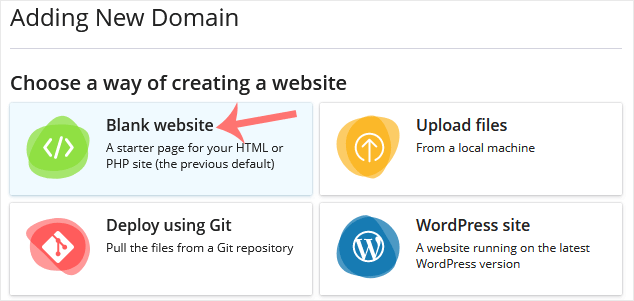 Follow this tutorial to add a new domain to your Plesk account. 1. Log in to your Plesk account. 2. Click on Websites & Domains from the Sidebar Menu. 3. Click on Add Domain. 4. Please, choose Blank Website as an option. 5. In Adding New Domain, enter the following details: Select your domain name: Choose the Registered domain name option. If you don't have a domain, choose Temporary domain name. Registered domain name: Enter your domain name. Hosting Type: Select Website Hosting from the drop-down menu. You can leave all other options as they are. 6. Click on Add Domain. Once your domain is added, you can manage it from the Websites & Domains option.